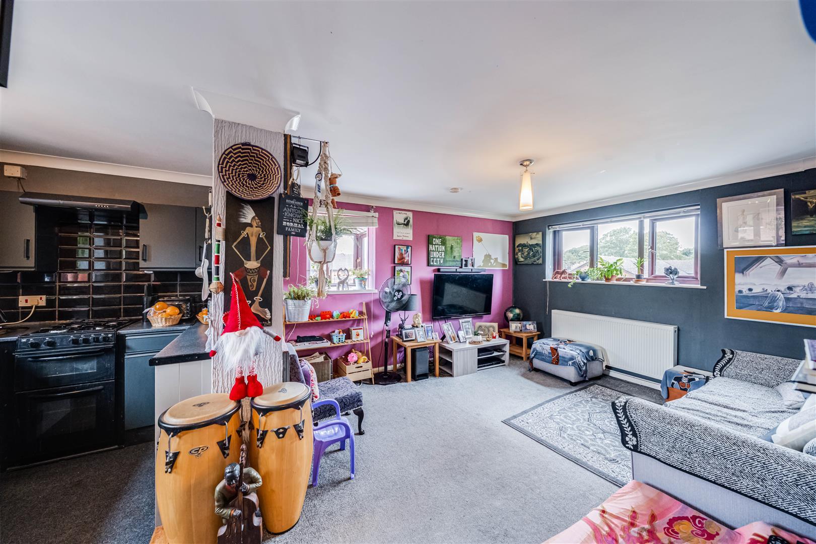 Located on the second floor of a purpose-built block on Woodfall Drive, this two-bedroom flat offers well-arranged accommodation. An entrance hall gives access to all rooms and includes two useful storage cupboards. The open-plan reception/kitchen measures approximately 3.74m x 6.22m, with defined living and dining zones. The kitchen provides a run of cabinets, worktops and tiled splashbacks, plus space for appliances including a cooker, washing machine and fridge-freezer. The flat is well-lit by multiple windows, and it features double glazing and gas central heating.