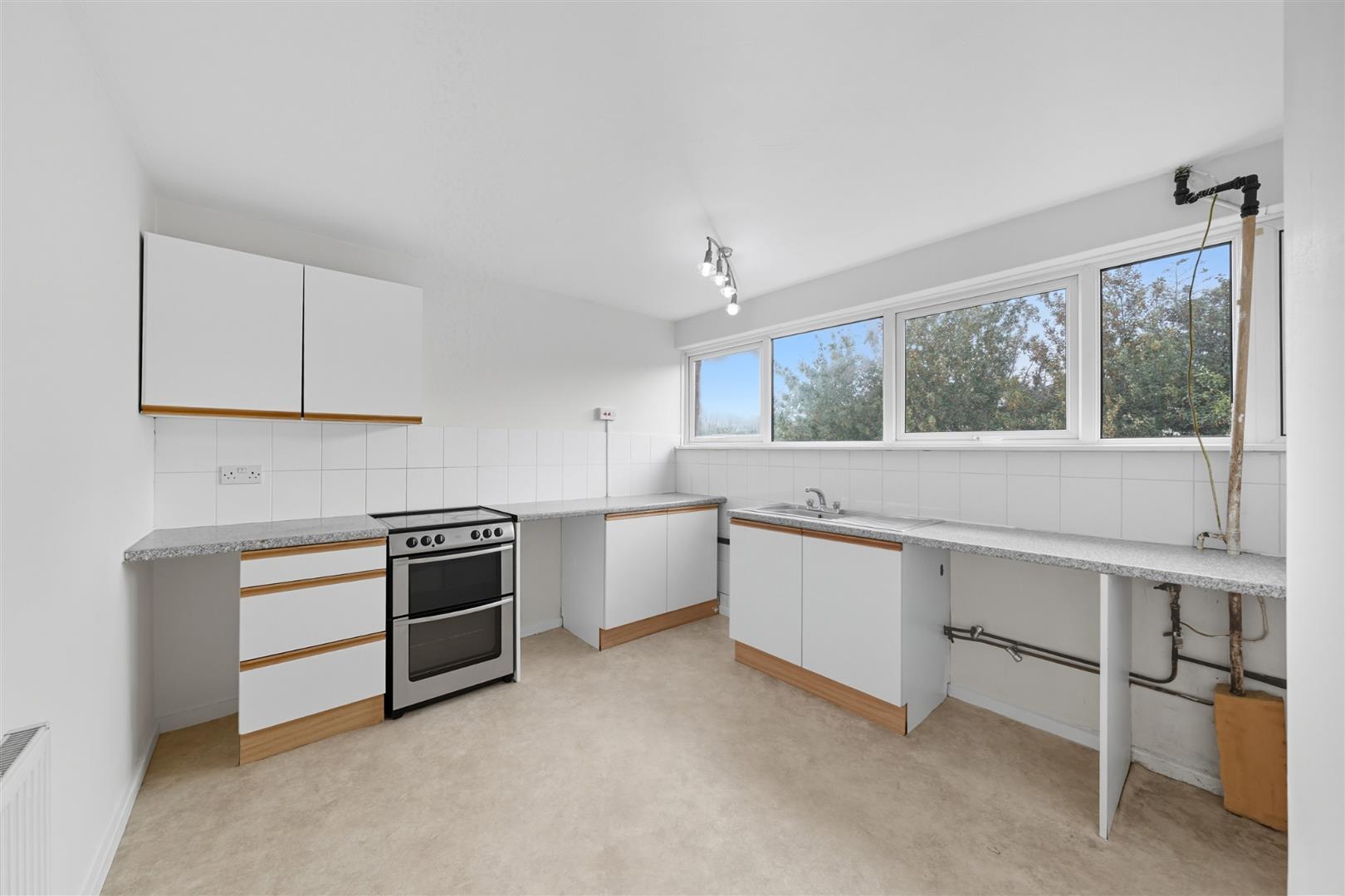 The entrance level comprises a welcoming hallway with useful storage. A generously sized reception room opens to a private balcony, creating a pleasant space for relaxation or entertaining. The separate kitchen provides ample worktop space, tiled splashbacks, a freestanding cooker, provision for appliances and the gas boiler—ideal for buyers wishing to refit to their own specification.
